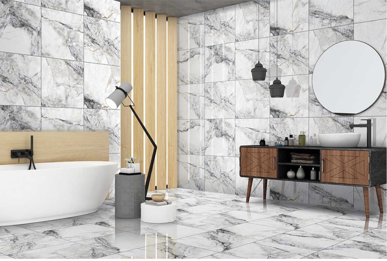 Marmara Ice is a striking grey and gold marble effect porcelain 60x60cm.